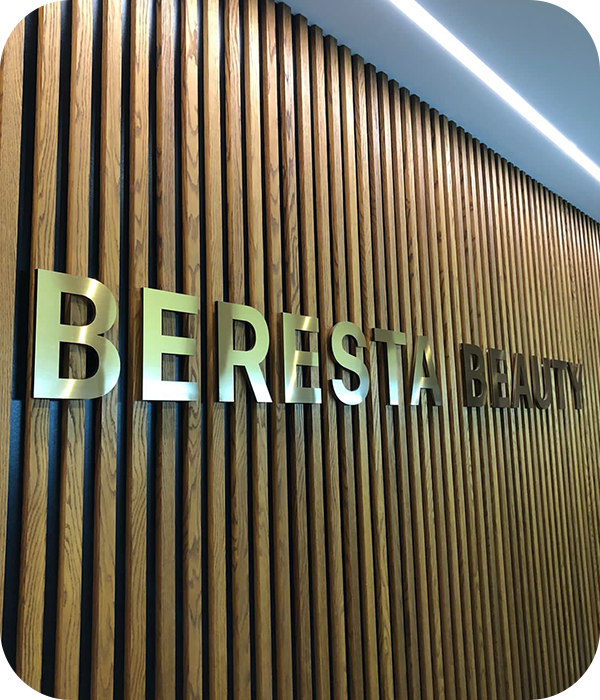 Вид металлических букв под золото или серебро бывает разным: зеркальная (глянцевая) поверхность создает эффект роскоши, отражая свет, а шлифованная дает сдержанный и благородный вид. Металлические буквы могут быть с подсветкой и без. Без подсветки их можно устанавливать в хорошо освещенных местах или создать с их помощью сдержанный образ. С контражурной подсветкой (предпочтительный вид свечения) вывеска заметна днем и ночью. Светодиоды равномерно освещают контур буквы.
