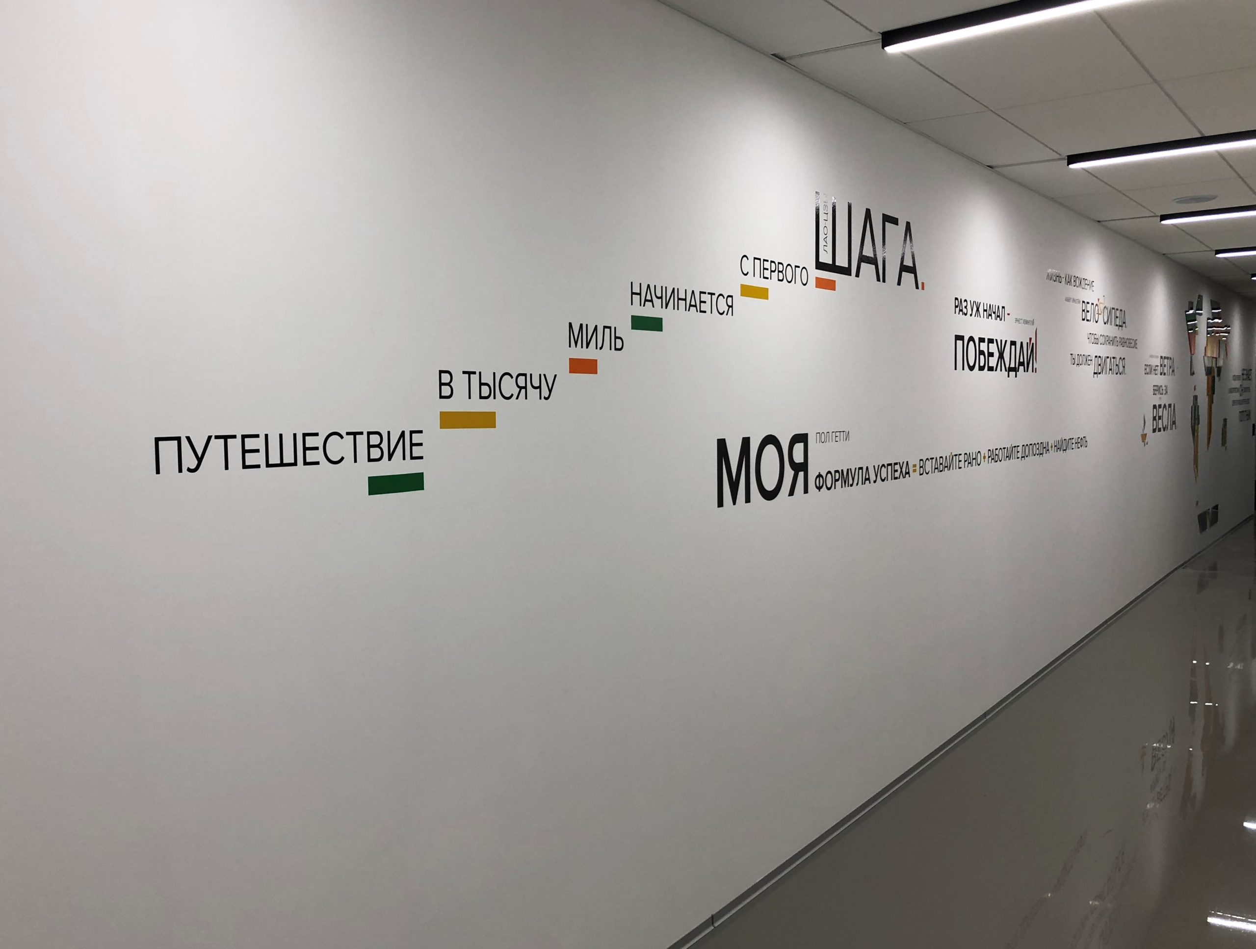 Доставка и установка требовалось по адресу: Архангельский пер., 1, Москва. Монтаж начинается с тщательной подготовки поверхности: стену очищают от пыли и грязи, обезжиривают. Поверхность должна быть ровной и сухой — это гарантирует плотное прилегание плёнки. Затем выполняется разметка: с помощью малярного скотча отмечают положение каждой аппликации, соблюдая симметрию и пропорции. После разметки проводят примерку: наклейку прикладывают к стене без отделения подложки, чтобы проверить точность расположения. Далее начинают монтаж: начиная с одного угла, постепенно отделяют подложку, прижимая монтажную плёнку к стене ракелем. Движения должны быть плавными, от центра к краям, чтобы избежать пузырей воздуха. После наклеивания всей композиции аккуратно снимают монтажную плёнку, ещё раз проглаживая поверхность ракелем. Если появляются пузырьки, их прокалывают иглой и разглаживают. В завершение проверяют оформление на наличие неровностей и при необходимости корректируют. В результате получается аккуратное, профессиональное брендирование, которое не только украшает офис, но и служит мощным мотивационным инструментом.