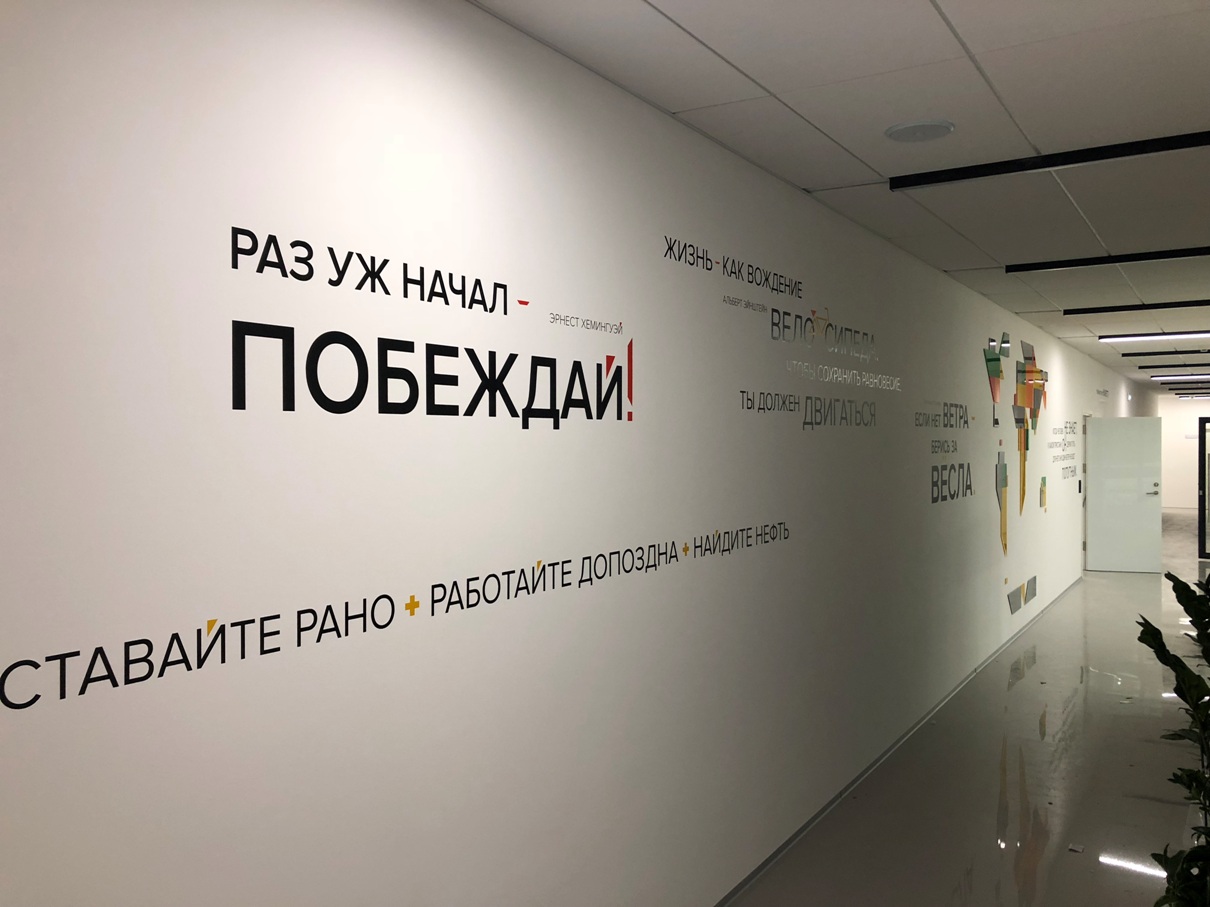 На встрече с клиентом уточнили размеры места установки, бюджет и требования к типу и дизайну брендирования офисов и помещений. Оформление стен офиса с использованием виниловых аппликаций — эффектный способ подчеркнуть корпоративную философию и мотивацию сотрудников. На изображении представлен яркий пример такого брендирования: крупные мотивационные слоганы («Раз уж начал — побеждай!», «Ставайте рано + работайте допоздна + найдите нефть»), цитаты известных личностей, а также метафорические фразы, связанные с деятельностью компании («Жизнь — как вождение», «Если нет ветра — берись за вёсла»). Такой дизайн создаёт атмосферу целеустремлённости, динамики и профессионализма, что особенно важно для нефтегазовой отрасли, где успех зависит от настойчивости, трудолюбия и умения преодолевать трудности. Цветовая гамма (чёрный текст на светлом фоне) выглядит лаконично и стильно, подчёркивая серьёзность бизнеса. Графические элементы дополняют текстовые слоганы, делая оформление визуально интересным.