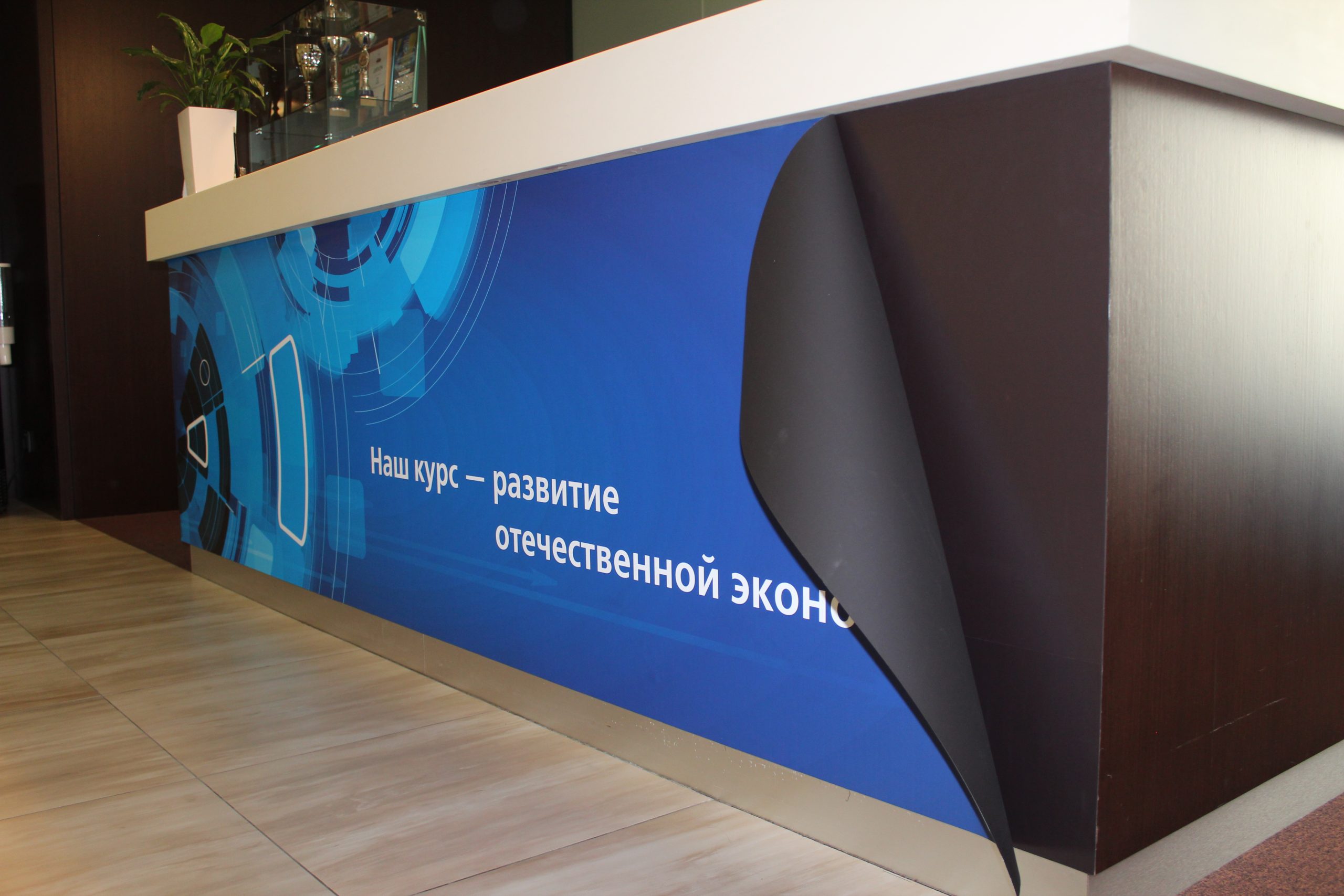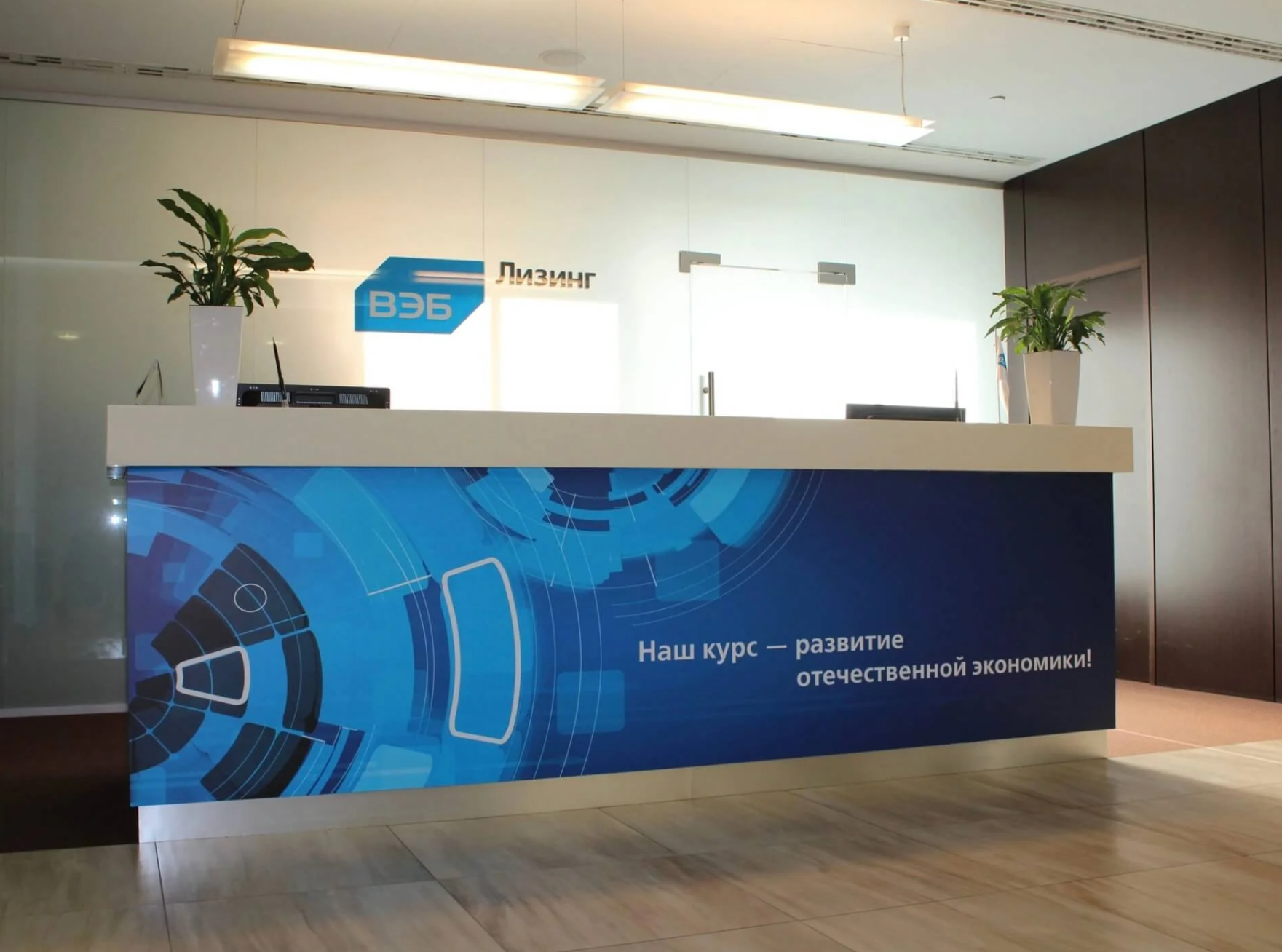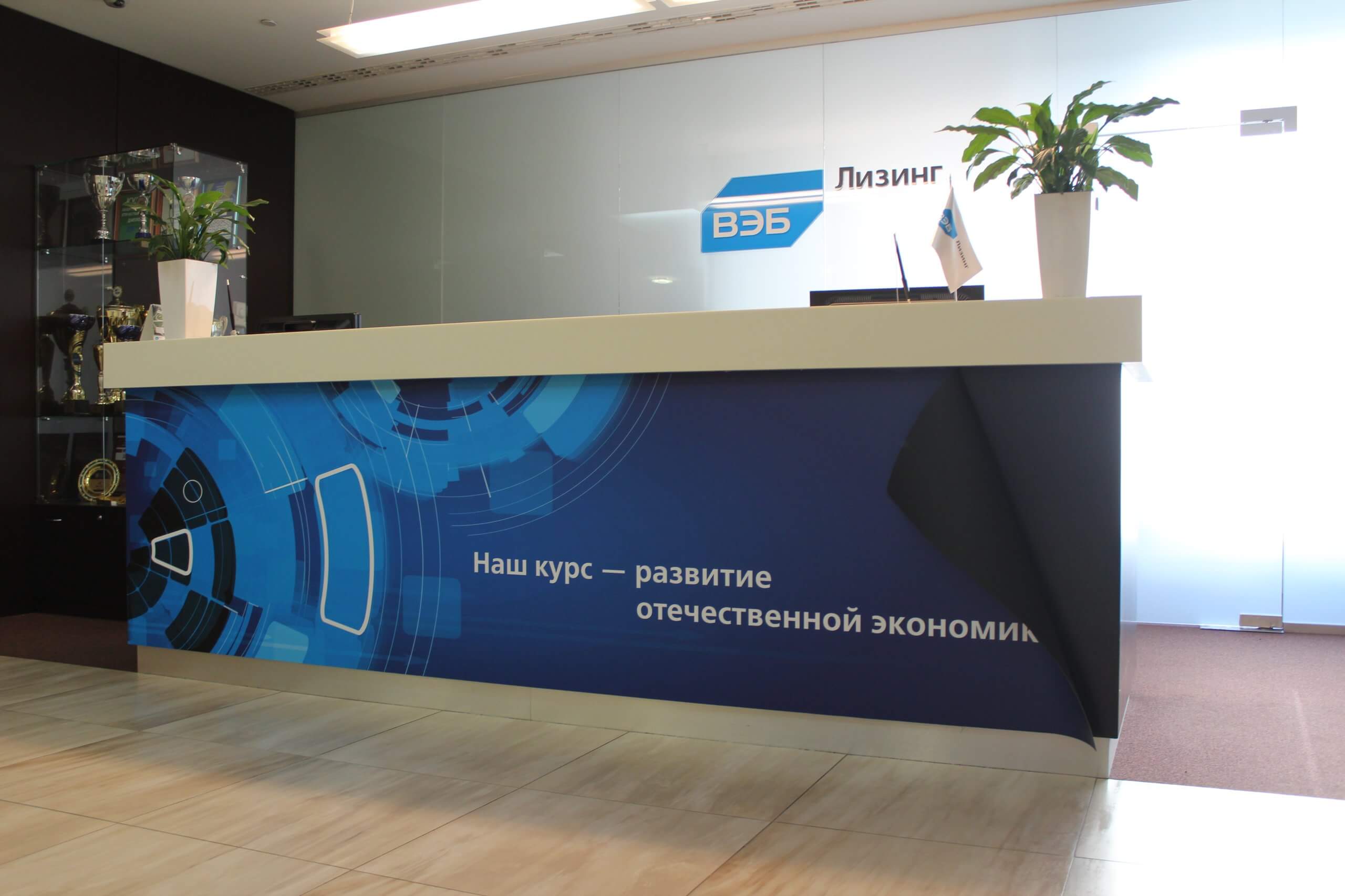 На встрече с клиентом уточнили размеры места установки, бюджет и требования к типу и дизайну брендирования офисов и помещений. Брендирование офиса лизинговой компании ВЭБ Лизинг выполнено в строгом, но современном стиле, подчёркивающем профессионализм и направленность на развитие экономики. Центральным элементом оформления стала стойка ресепшн с крупным фирменным панно. На нём изображён лаконичный абстрактный дизайн в синих тонах, символизирующий технологичность и надёжность. Ключевой слоган «Наш курс — развитие отечественной экономики» чётко транслирует миссию компании. Логотип ВЭБ Лизинг размещён на стене за стойкой, что создаёт целостный визуальный образ.