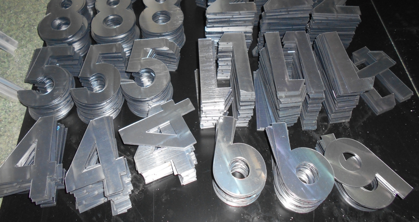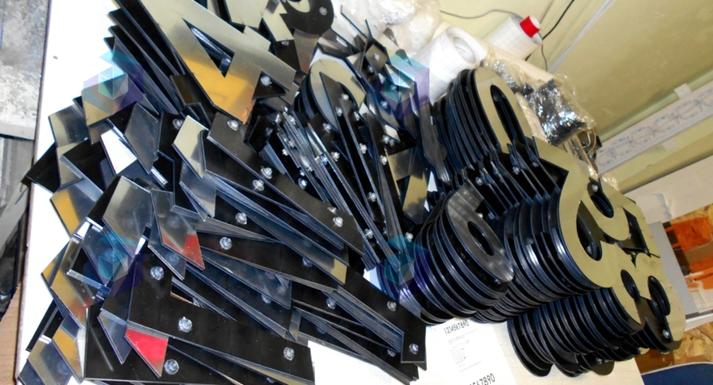 На встрече с клиентом уточнили размеры, место установки и пожелания по цвету и фактуре. Для проекта были изготовлены две серии цифр: маленькие и большие. Маленькие цифры однослойные, выполнены из пластика под шлифованное серебро высотой 10 см. Большие цифры — двухслойные: верхний слой из пластика под шлифованное серебро, нижний слой — алюминиевый композитный материал (АКП) толщиной 3 мм. Конструкция установлена на дистанционных держателях высотой 15 мм, создающих лёгкий объёмный эффект и визуальную глубину.