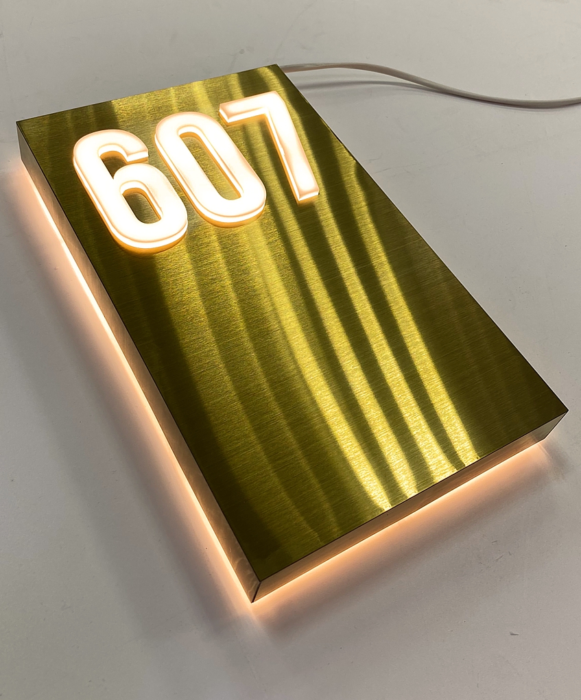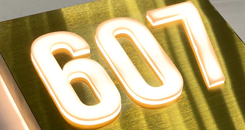 На встрече с клиентом были уточнены размеры элементов, место установки и особенности дизайна. Номер квартиры «607» изготовлен из нержавеющей стали золотого цвета с горизонтальной шлифовкой. Цифры выполнены с инкрустацией акрилом. Подсветка реализована в двух форматах: внутренняя подсветка цифр и контражурная подсветка, обеспечивающая выразительный световой контур вокруг номера.