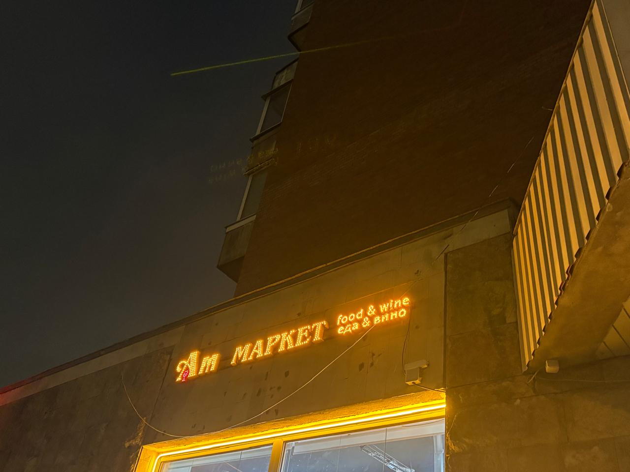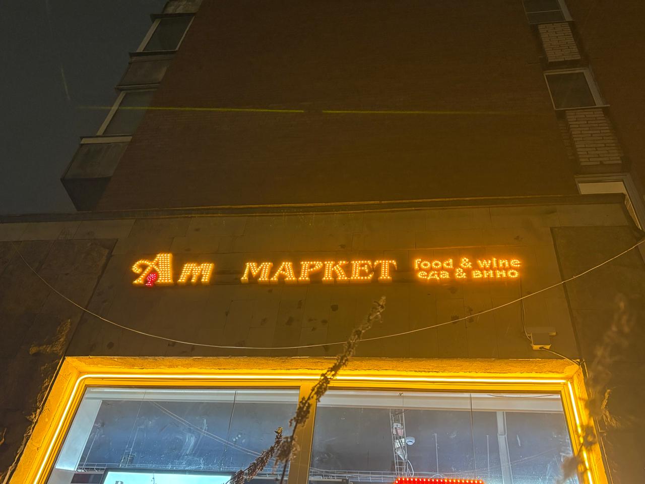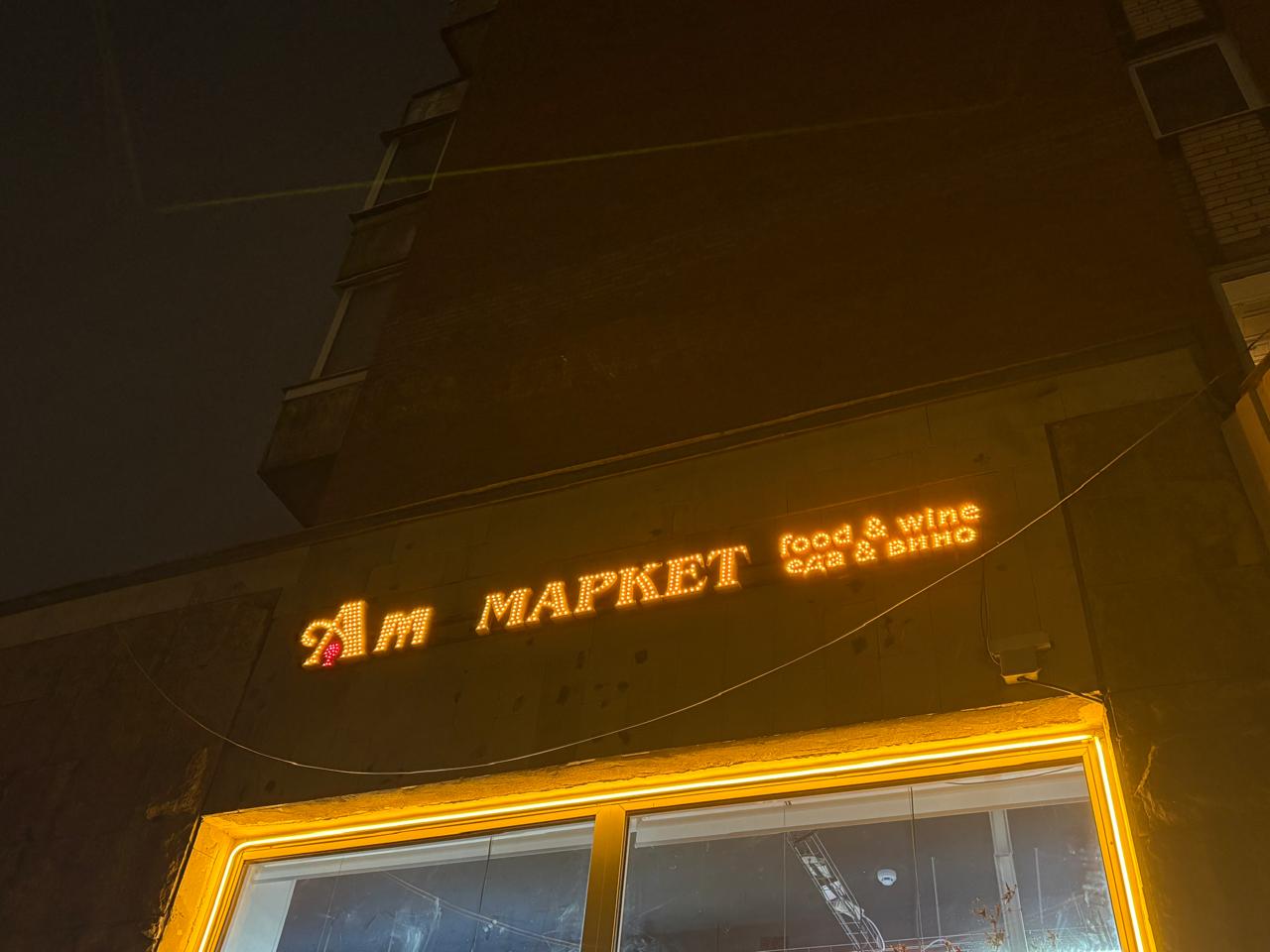 На встрече с клиентом были уточнены размеры фасадной зоны, место размещения и технические детали подключения. После согласования разработан эскиз: надпись «Am Market» с акцентом на букву «A» и равномерной тёплой подсветкой по всему периметру букв.