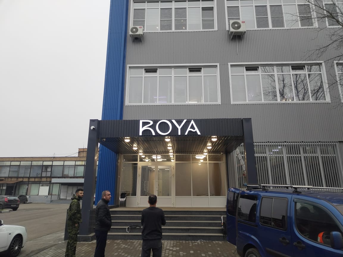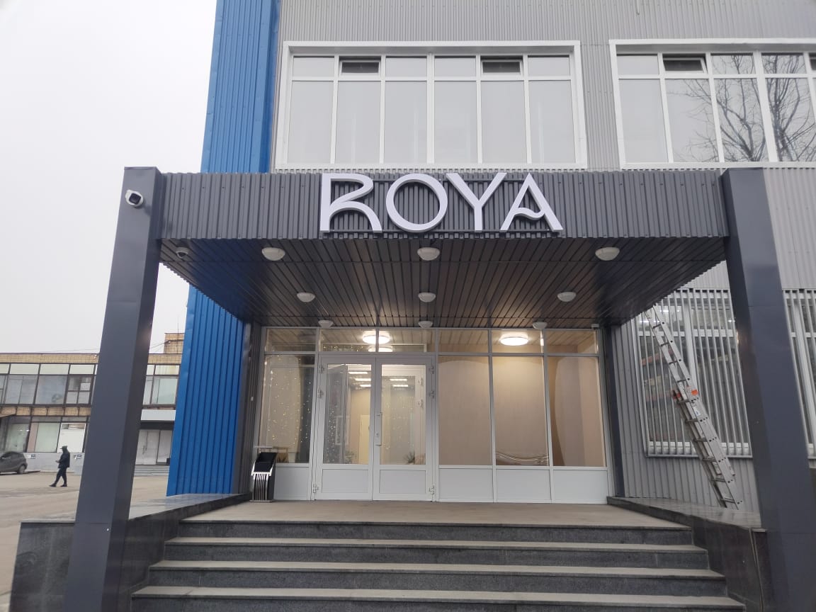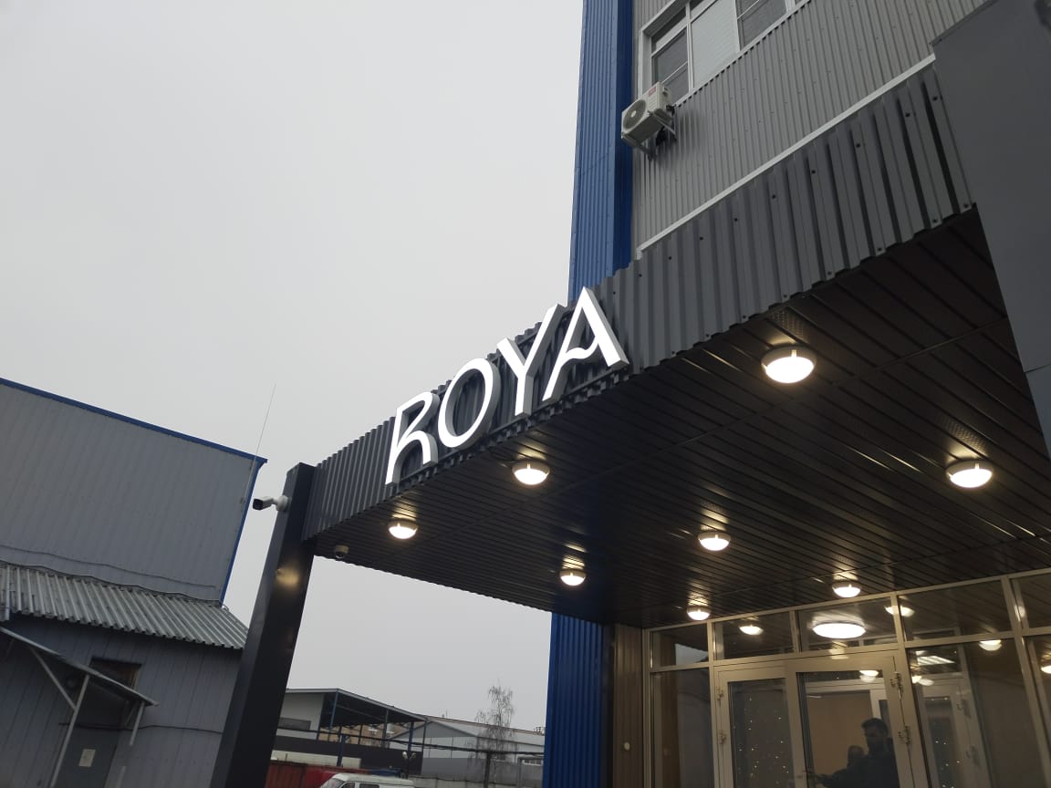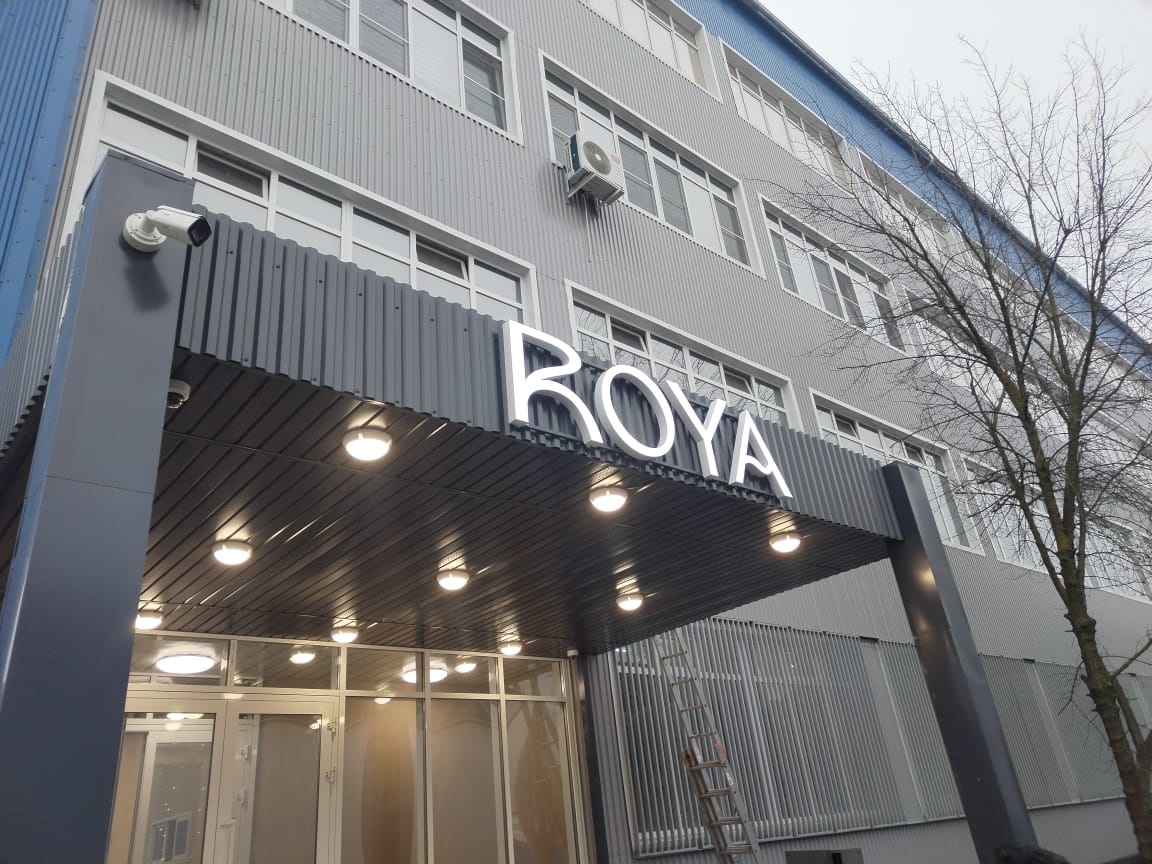 На встрече с клиентом уточнили размеры места установки, бюджет и требования к типу и дизайну объемных букв из жидкого акрила. Оформление объёмных букв из жидкого акрила для производственного предприятия выглядит современно и технологично: такие буквы отличаются яркой, равномерной засветкой, отсутствием затемнений по краям и высокой прочностью. Лаконичные объёмные буквы «ROYA» органично вписаны в архитектуру здания, подчёркивая его деловой стиль. Акрил обеспечивает насыщенный цвет, который не выгорает со временем, а светорассеивающий эффект делает вывеску заметной в любое время суток. Конструкция сочетает металлический каркас и заливной акрил, что придаёт буквам монолитность и устойчивость к внешним воздействиям — от перепадов температур до механических ударов.