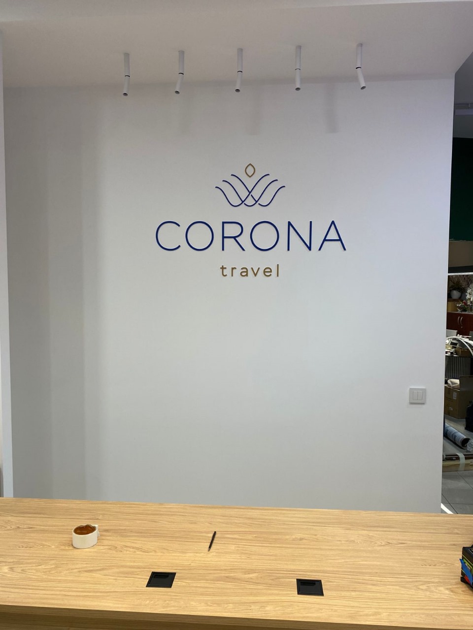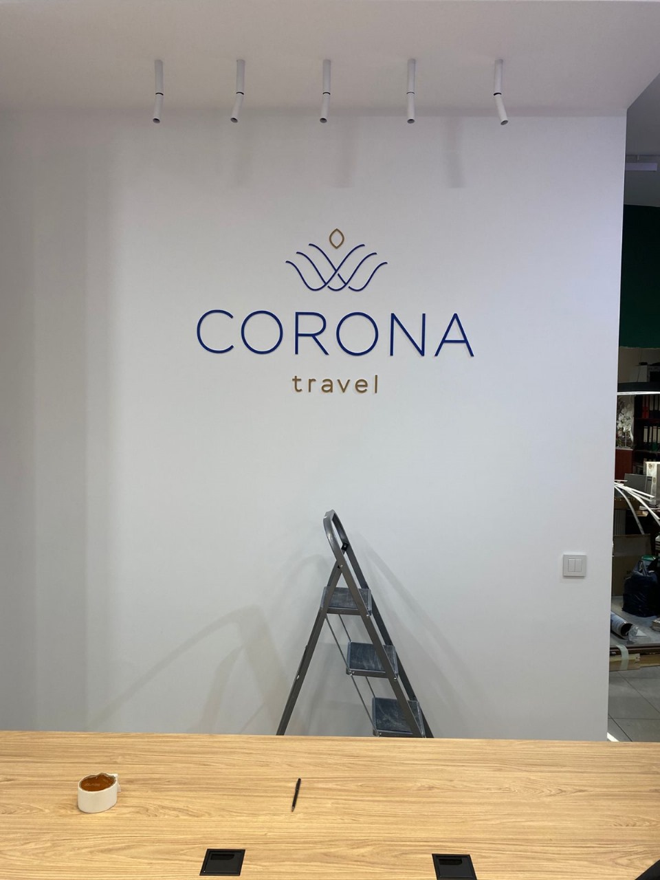 На встрече с клиентом уточнили размеры места установки, бюджет и требования к типу и дизайну плоских букв из металла. Оформление плоских букв из металла для туроператора «CORONA travel» выполнено в лаконичном и современном стиле. Буквы закреплены на стене, создавая эффект «парения» над поверхностью, что подчёркивает премиальность бренда. Использована комбинация цветов: тёмно-синий для основного названия и золотой для слова «travel», что добавляет выразительности и акцентирует внимание на специализации компании. Графический элемент над надписью усиливает визуальную привлекательность, гармонично дополняя композицию. Такое оформление идеально подходит для зоны ресепшн — оно одновременно функционально и эстетично, формирует первое впечатление о компании как о надёжном и стильном партнёре в сфере туризма.
