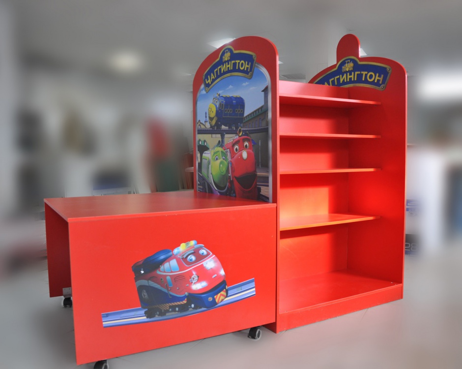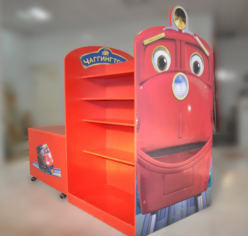 На встрече с клиентом уточнили размеры места установки, бюджет и требования к типу и дизайну POS-материалов. Оформление POS-материала для детского магазина выполнено в ярком, привлекающем внимание стиле с использованием насыщенно-красного цвета, который ассоциируется с энергией и активностью, идеально подходя для детской аудитории. Центральным элементом дизайна стали персонажи популярного детского мультфильма про паровозики — их изображения размещены на столешнице и декоративных панелях стойки. Надписи: «Чаггингтон» выполнены крупным шрифтом с декоративной рамкой, что усиливает ассоциацию с тематикой мультфильма и делает стойку легко узнаваемой. Композиция сочетает функциональные зоны: рабочую поверхность и открытые полки для выкладки товаров, объединённые в единую конструкцию. Такой дизайн не только привлекает внимание детей, но и стимулирует интерес к товарам, размещённым на стойке.