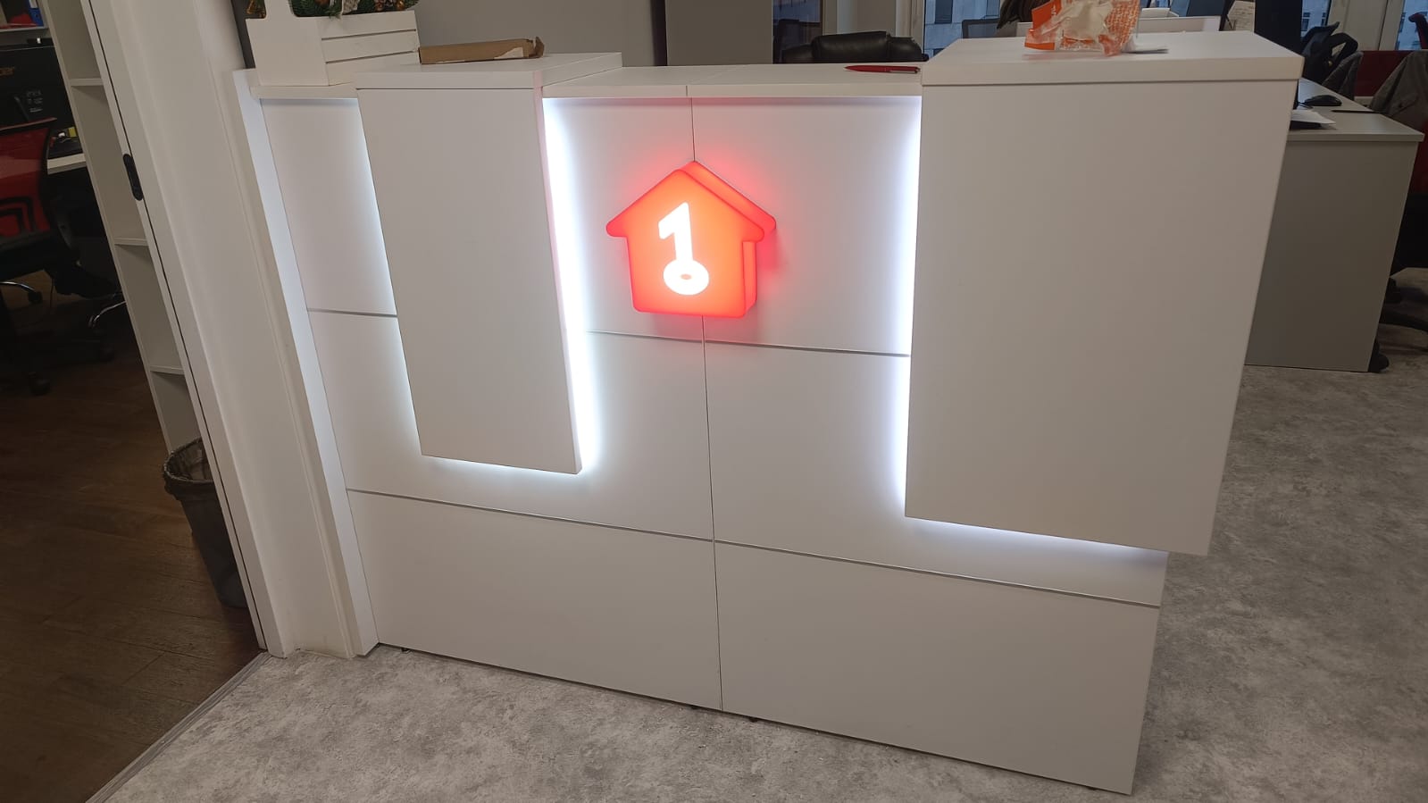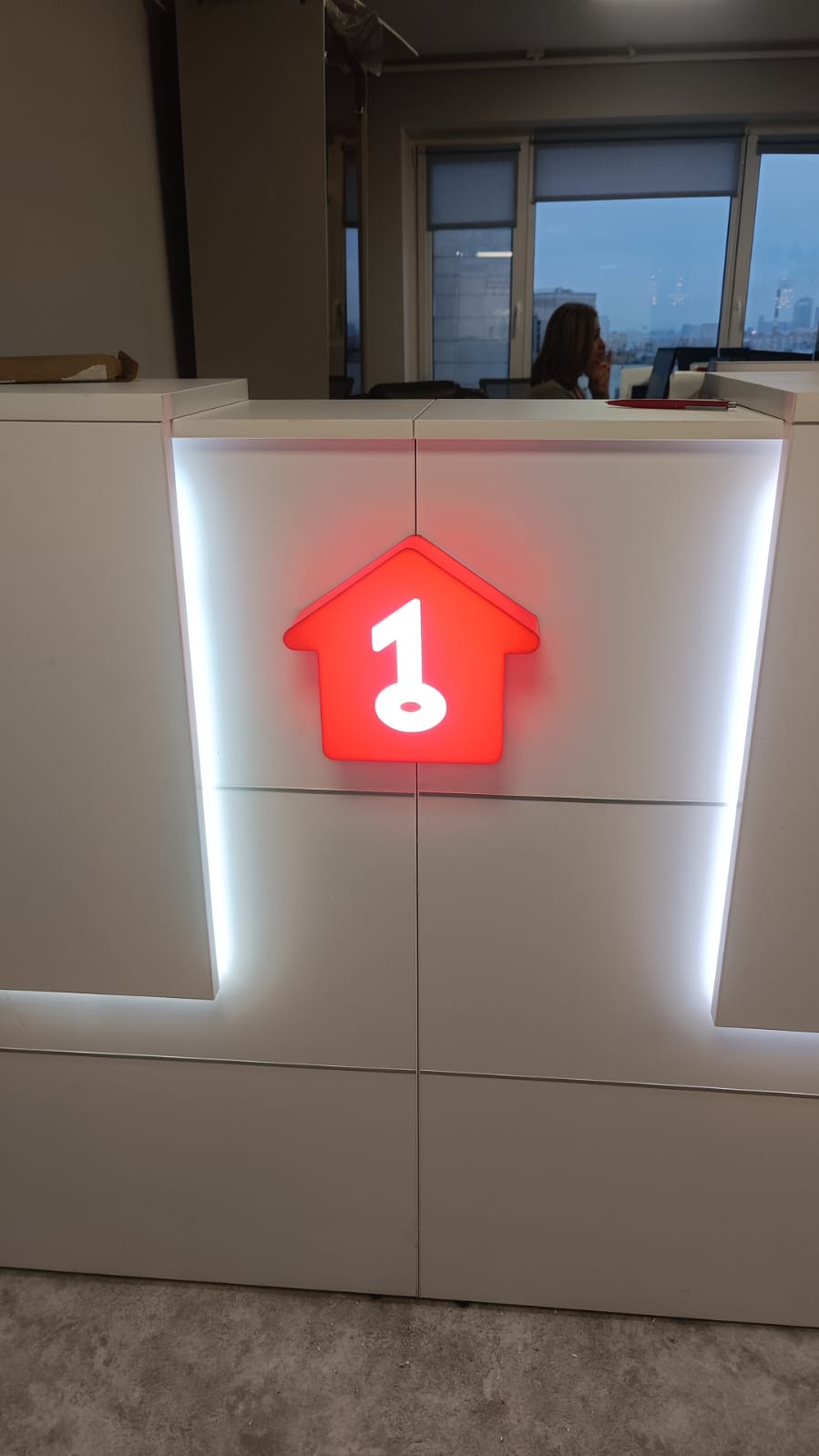 На встрече с клиентом уточнили размеры места установки, бюджет и требования к типу и дизайну фигурного светового короба. Оформление фигурного светового короба для агентства недвижимости представляет собой яркий акцент в интерьере — выразительный логотип в виде домика с цифрой «1» внутри, подсвеченный изнутри. Красный цвет корпуса привлекает внимание, создаёт ассоциацию с надёжностью и энергией, а встроенная подсветка делает элемент заметным даже в полутёмном помещении. Такой короб органично вписывается в зону ресепшн, подчёркивая фирменный стиль компании и создавая дружелюбную атмосферу для клиентов. Фигурная форма (контур домика) добавляет креативности и запоминаемости, а лаконичные линии и минимализм оформления соответствуют современным трендам в дизайне офисных пространств.