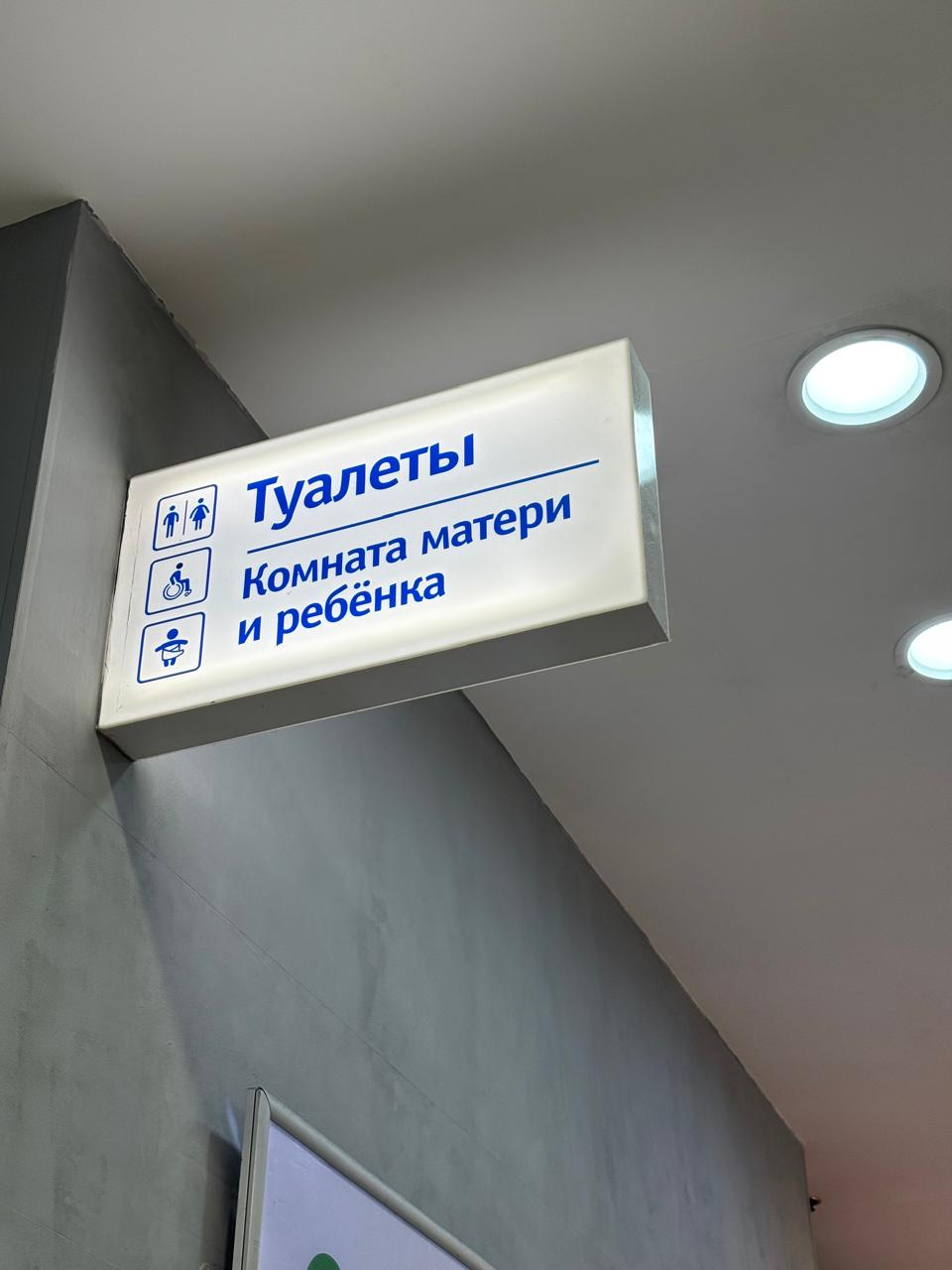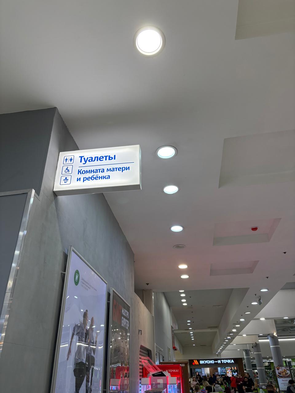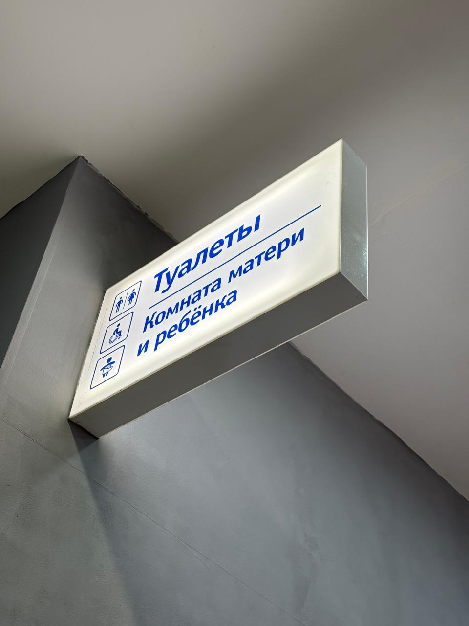 На встрече с клиентом уточнили размеры зоны установки, цветовое решение и требования к внешнему виду. В результате было принято решение изготовить большой прямоугольный световой короб 600 мм × 400 мм из молочного акрила с подсветкой. Значки и графические элементы выполнены синим цветом. Конструкция закреплена на стене внутри ТРК.