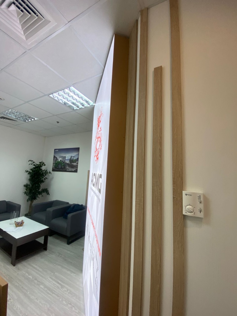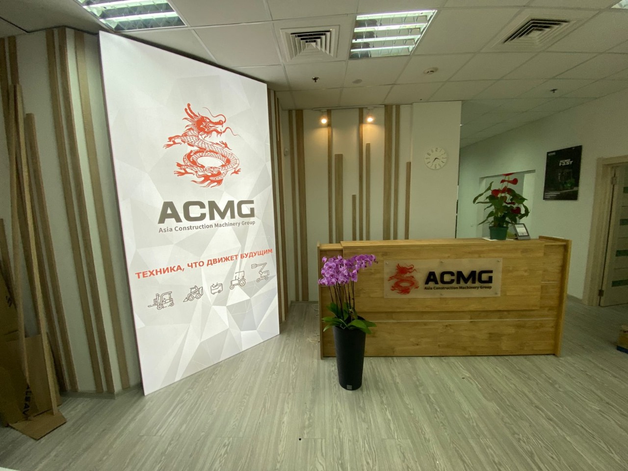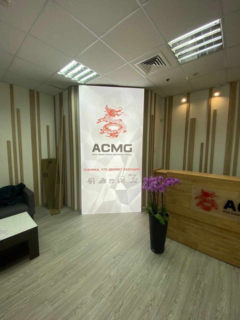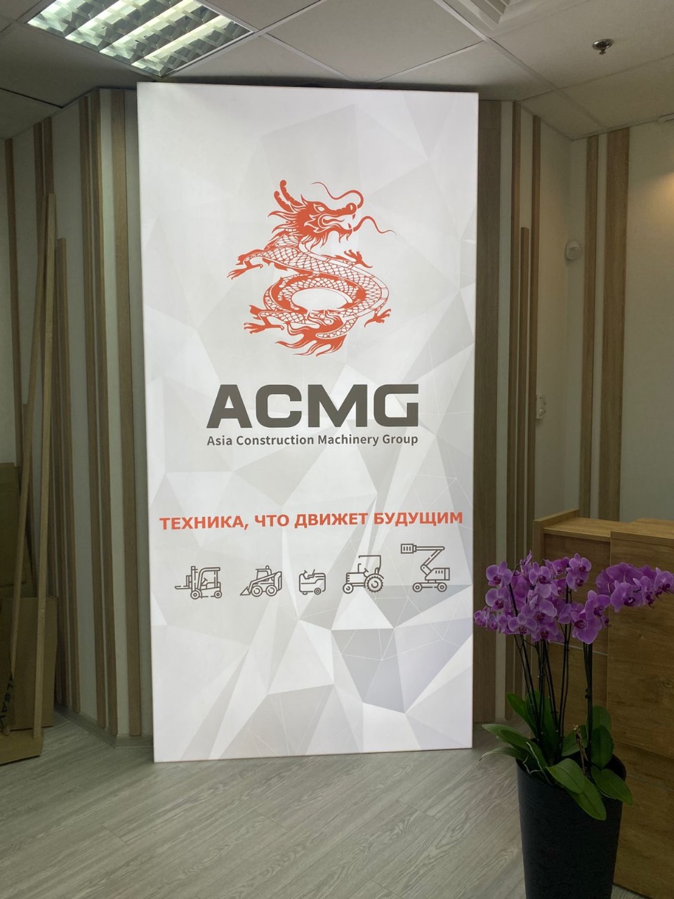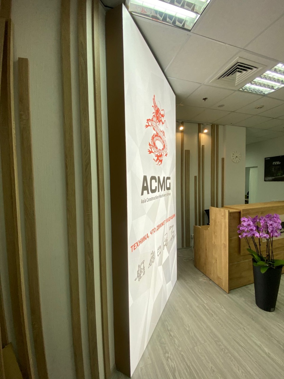 На встрече с клиентом уточнили размеры места установки, бюджет и требования к типу и дизайну светового короба из акрила. Оформление светового короба из акрила для медиагруппы ACMG выполнено в лаконичном и современном стиле. В центре композиции — яркий красный китайский дракон, символизирующий силу и динамику, под ним размещён логотип в строгом шрифте. Слоган «ТЕХНИКА, ЧТО ДВИЖЕТ БУДУЩИМ» выделен насыщенным красным цветом, гармонирующим с изображением дракона. Ниже расположены пиктограммы строительной техники, подчёркивающие специализацию компании. Фон выполнен с геометрическим 3D-эффектом в светлых оттенках, что придаёт объём и визуальную лёгкость конструкции. Общий дизайн сочетает корпоративную эстетику с элементами азиатской символики, создавая запоминающийся образ.