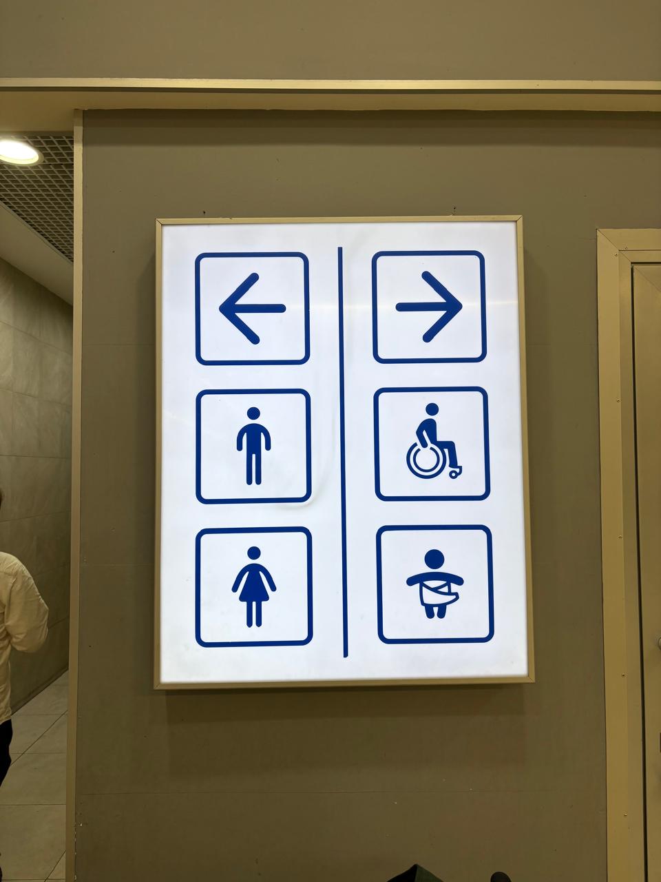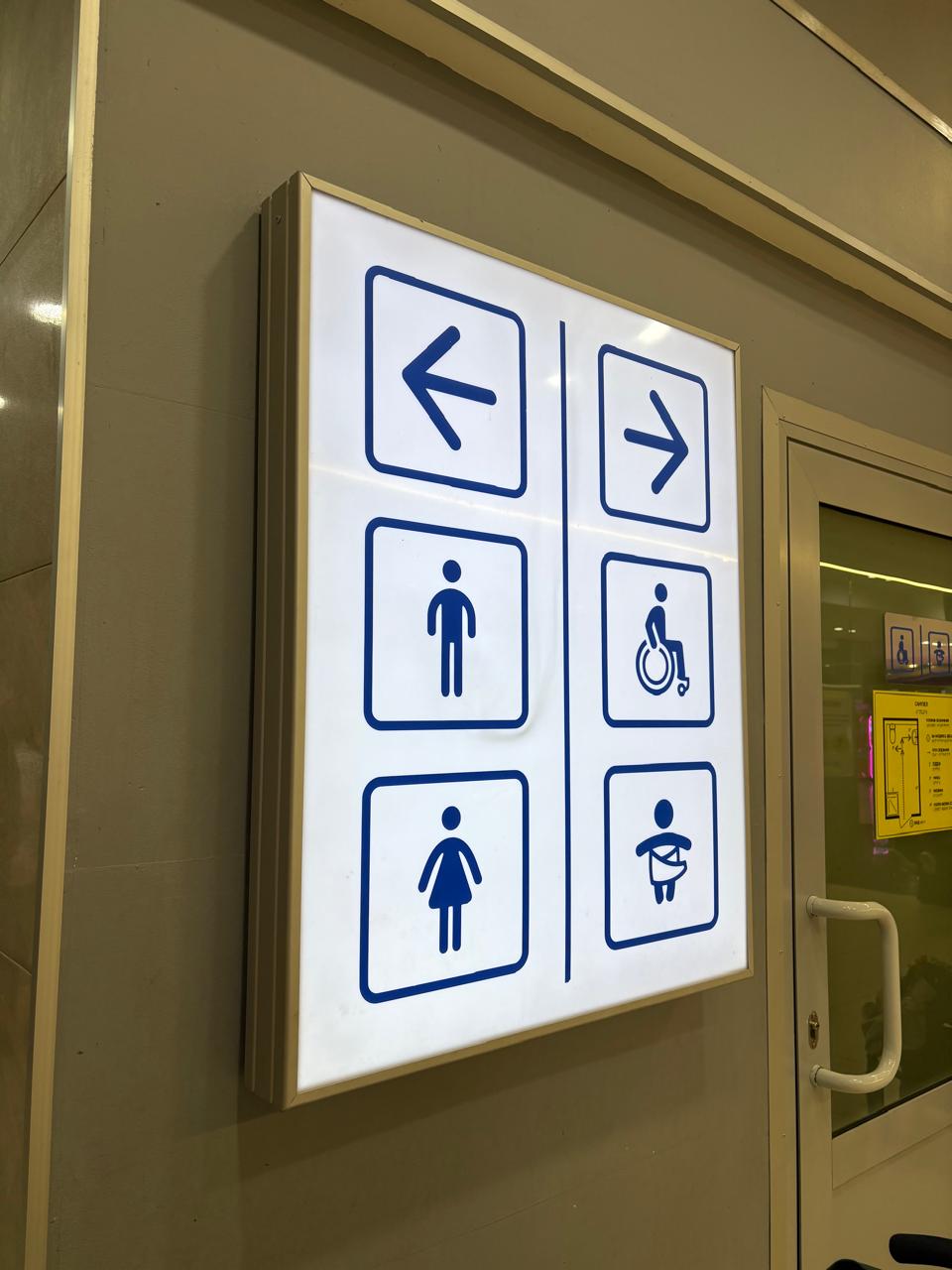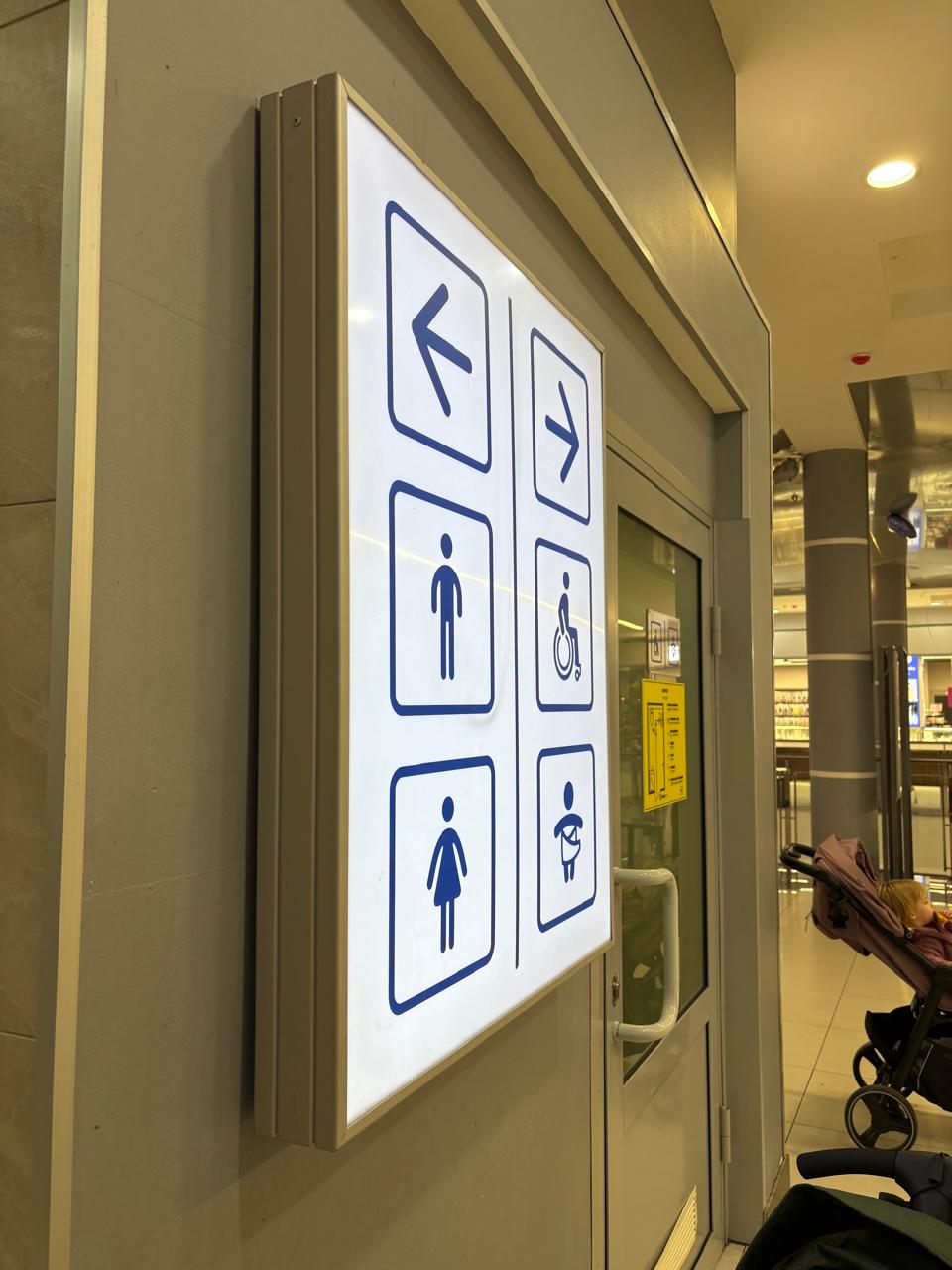 На встрече с клиентом уточнили размеры зоны установки, цветовое решение и требования к внешнему виду. В результате было принято решение изготовить большой прямоугольный световой короб 1200 мм × 800 мм из молочного акрила с подсветкой. Значки и графические элементы выполнены синим цветом, рамка короба изготовлена из алюминиевого профиля для дополнительной прочности. Конструкция закреплена на стене внутри ТРК.