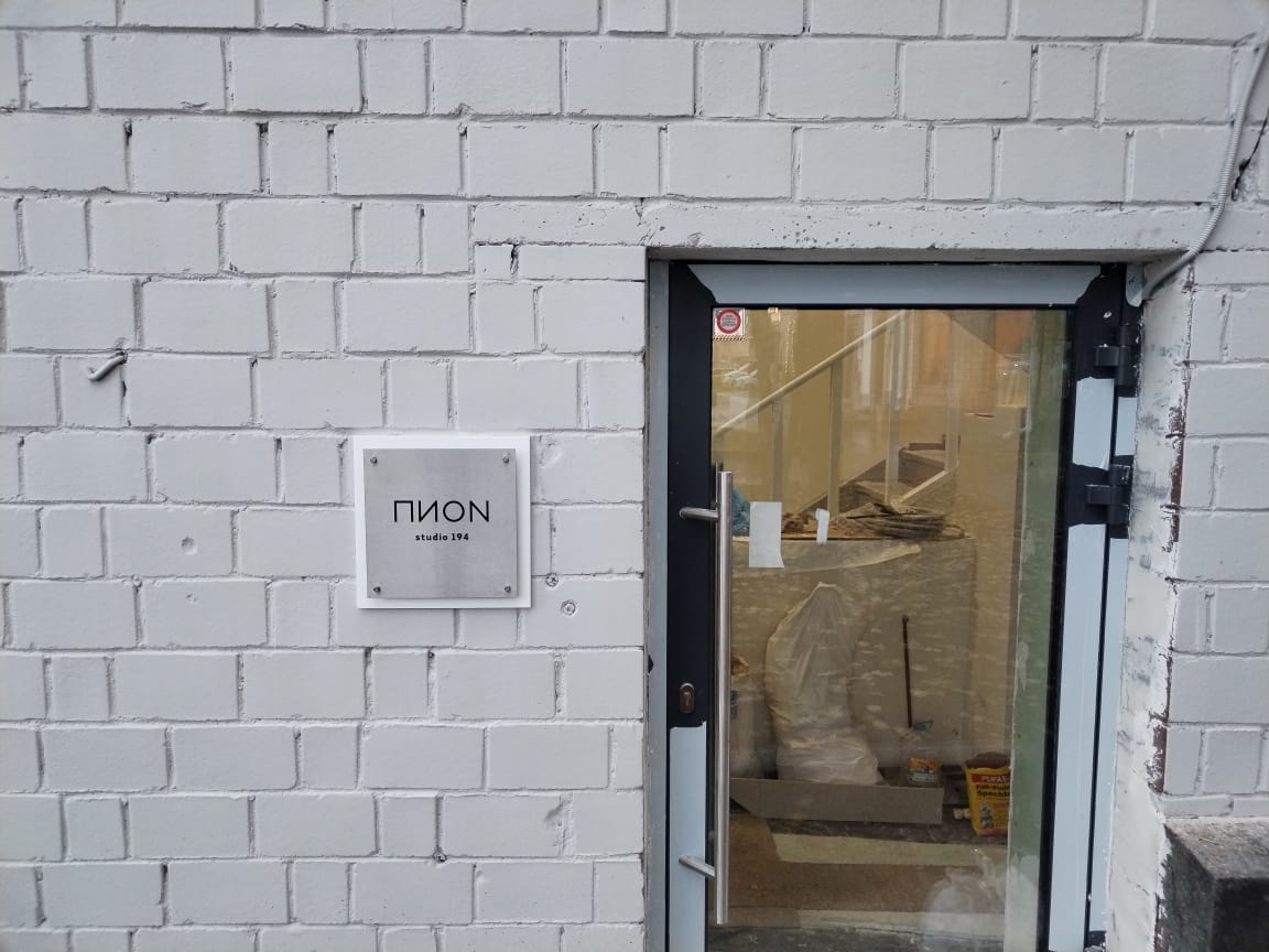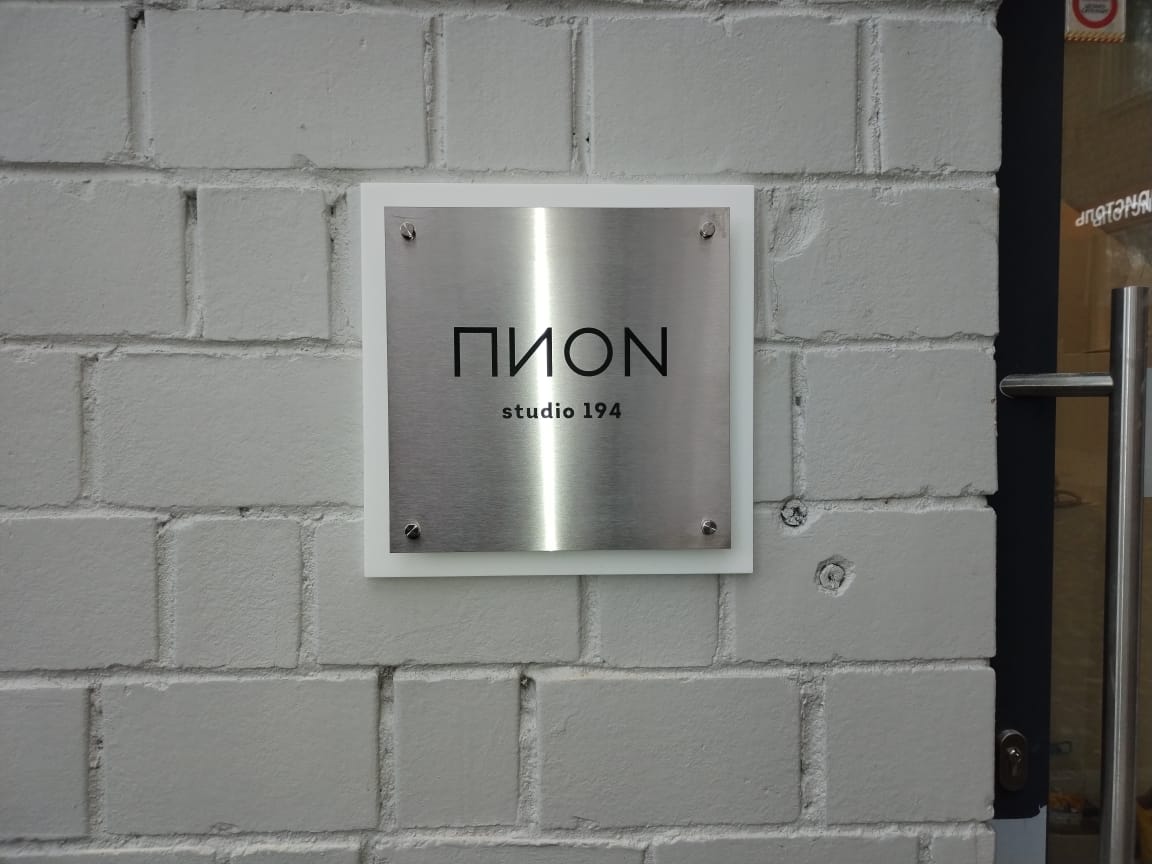 На встрече с клиентом уточнили размеры места установки, бюджет и требования к типу таблички из металла с УФ-печатью. Оформление металлической таблички с УФ-печатью для спа-салона — это сочетание лаконичного дизайна и современных технологий. На изображении представлена табличка с названием «ПИОН studio 194», выполненная на металлической основе с матовой поверхностью, обрамлённой аккуратной рамкой. Такой дизайн подчёркивает премиальность и современность спа-салона, создаёт ощущение чистоты и минимализма, что особенно актуально для индустрии красоты и релаксации. Шрифт выбран строгий, с чёткими линиями, что делает надпись легко читаемой с расстояния. Контраст между тёмным текстом и светлым металлом усиливает визуальное восприятие.