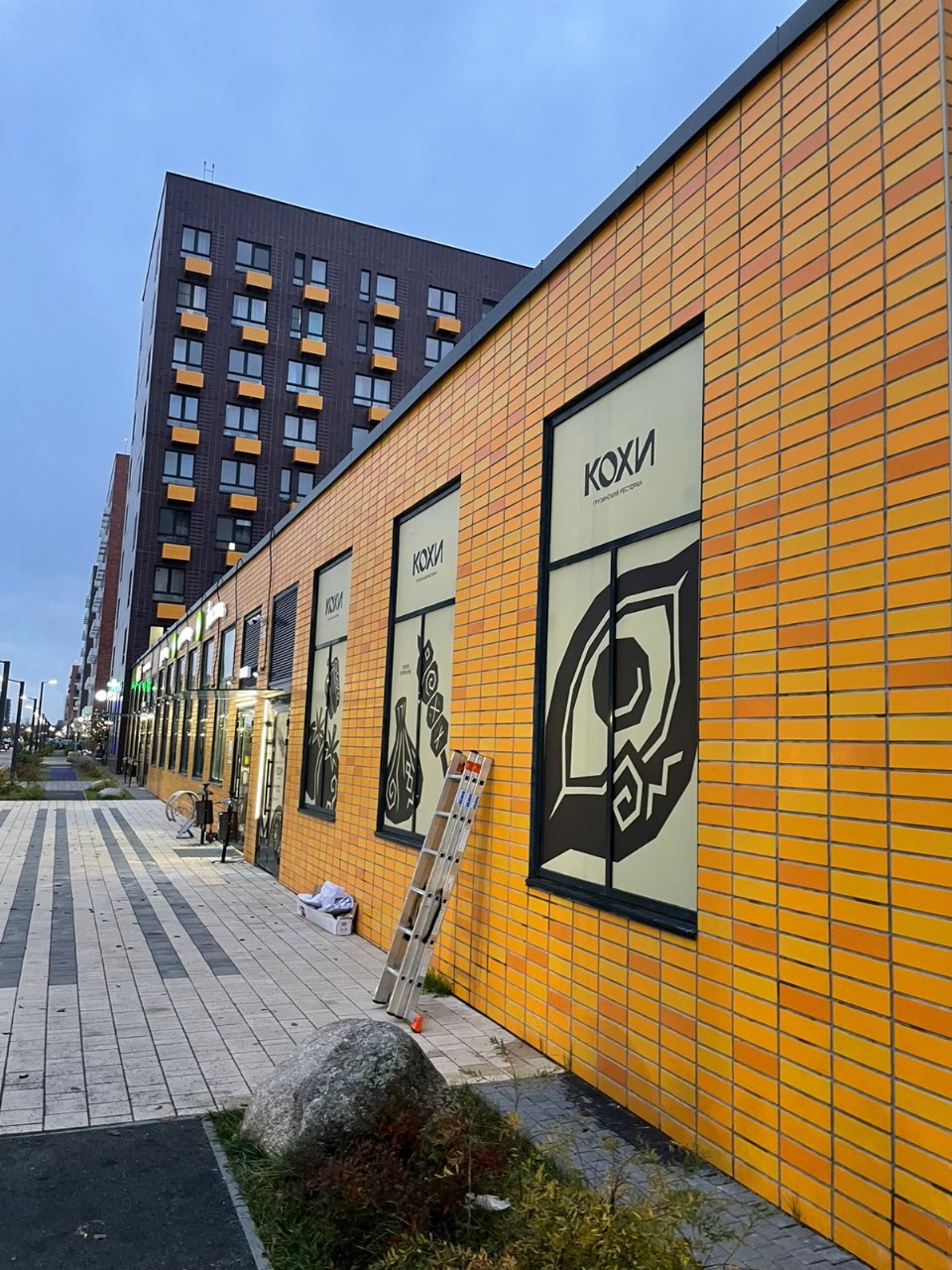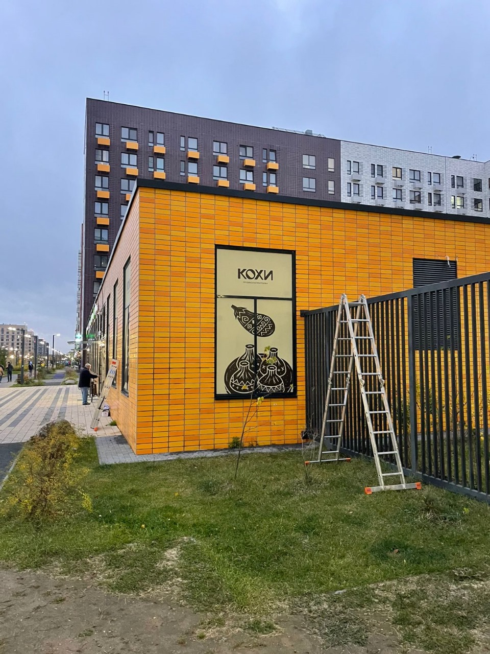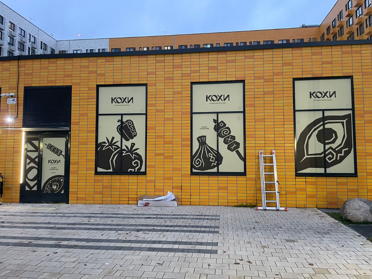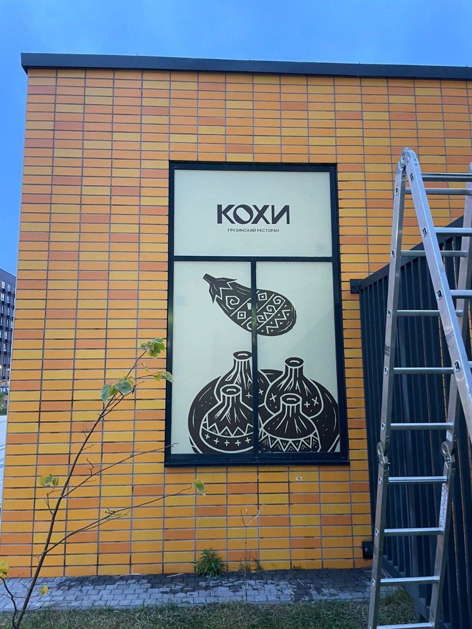 На встрече с клиентом уточнили размеры места установки, бюджет и требования к типу и дизайну оформления входной группы. Оформление входной группы грузинского ресторана «КОХИ» выполнено в современном стиле с этническими мотивами. Яркая жёлто-оранжевая облицовка фасада задаёт тёплый, гостеприимный тон, характерный для грузинской культуры. Витрины украшены крупными чёрно-белыми виниловыми аппликациями с изображениями традиционных грузинских блюд и орнаментов, что сразу погружает посетителей в атмосферу заведения. Логотип ресторана лаконично размещён в верхней части каждой витрины, создавая баланс между этникой и минимализмом. Дизайн одновременно привлекает внимание и сохраняет аутентичность, подчёркивая кулинарную специфику ресторана.