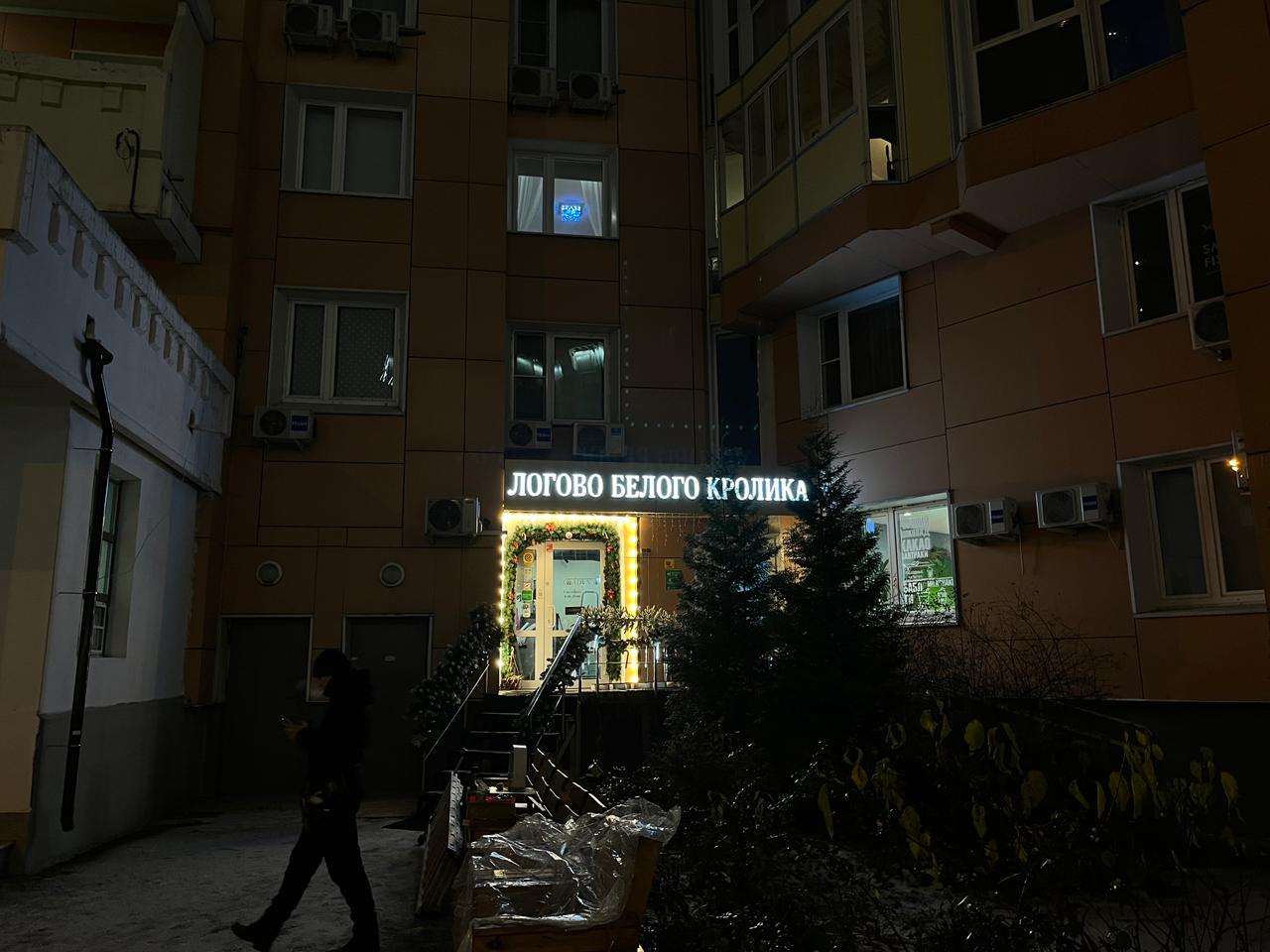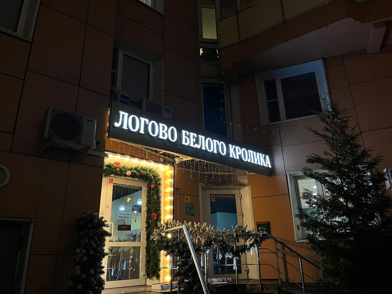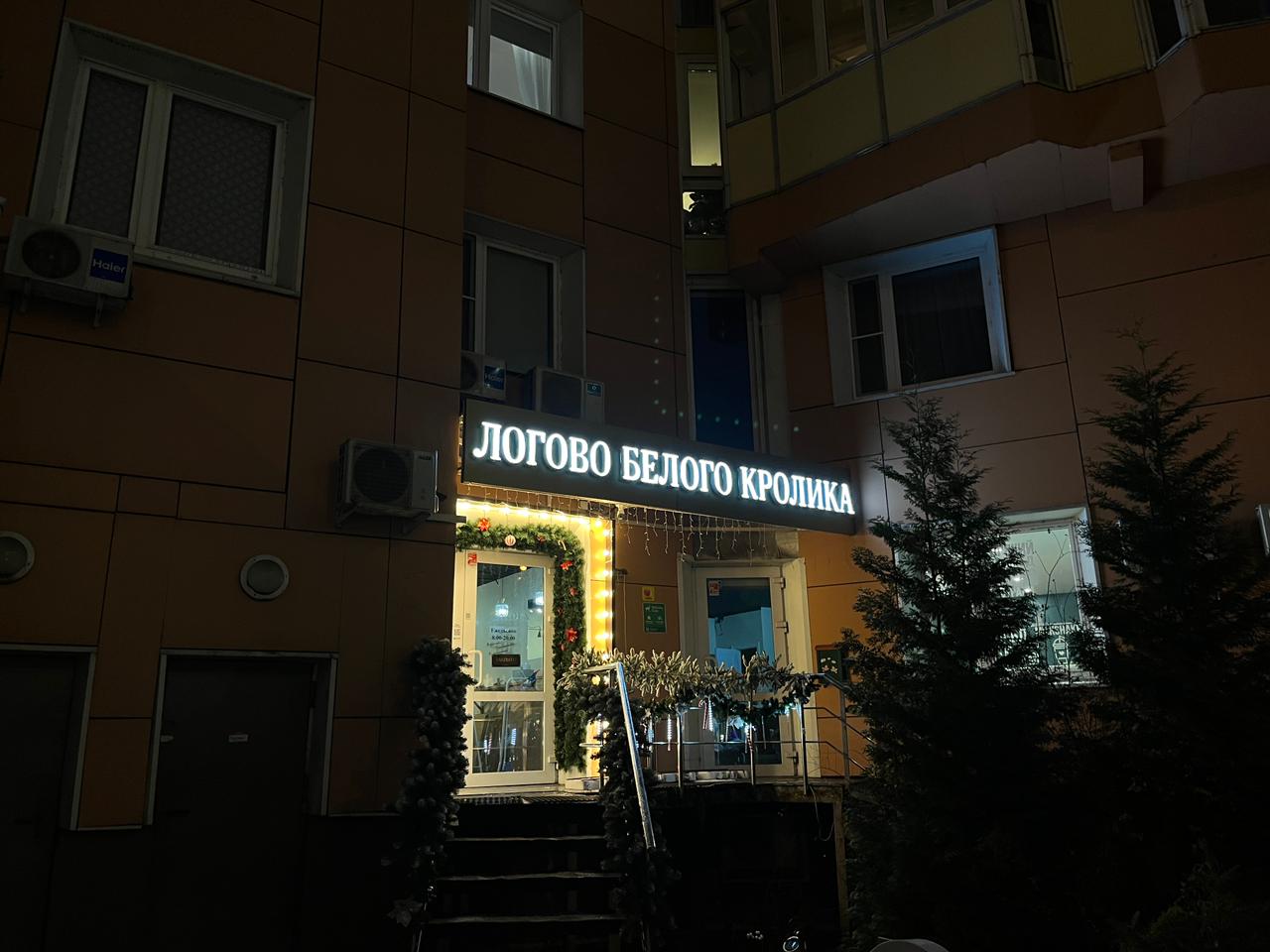На встрече с клиентом уточнили размеры места установки, бюджет и требования к типу и дизайну входной группы. Оформление входной группы кофейни «Логово Белого Кролика» выполнено в праздничном, уютном стиле, который сразу привлекает внимание. Центральным элементом является яркая световая вывеска с названием заведения, создающая акцент и делающая вход заметным даже в тёмное время суток. Входная зона украшена гирляндами с тёплым светом, которые обрамляют дверь и лестницу, добавляя ощущение уюта и гостеприимства. Дополнительно используются декоративные элементы — хвойные ветви и небольшие украшения. Всё оформление гармонично сочетается с фасадом здания, не перегружая его, но делая вход запоминающимся.