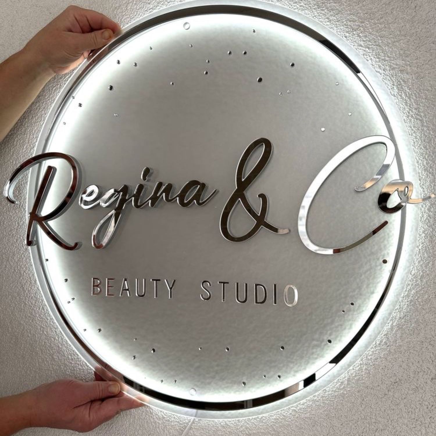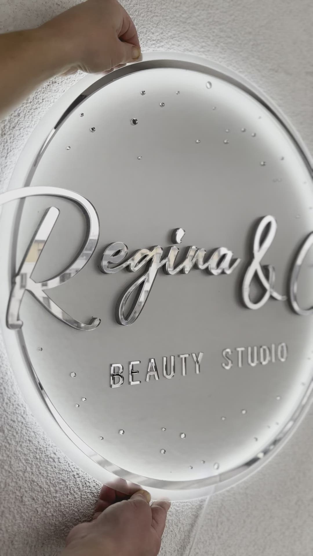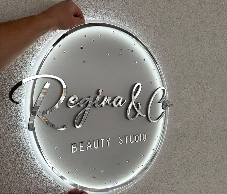 • зеркальная вывеска в виде логотипа с фирменным названием салона;