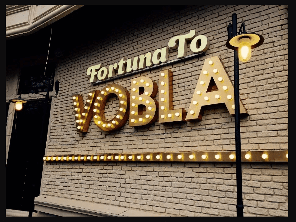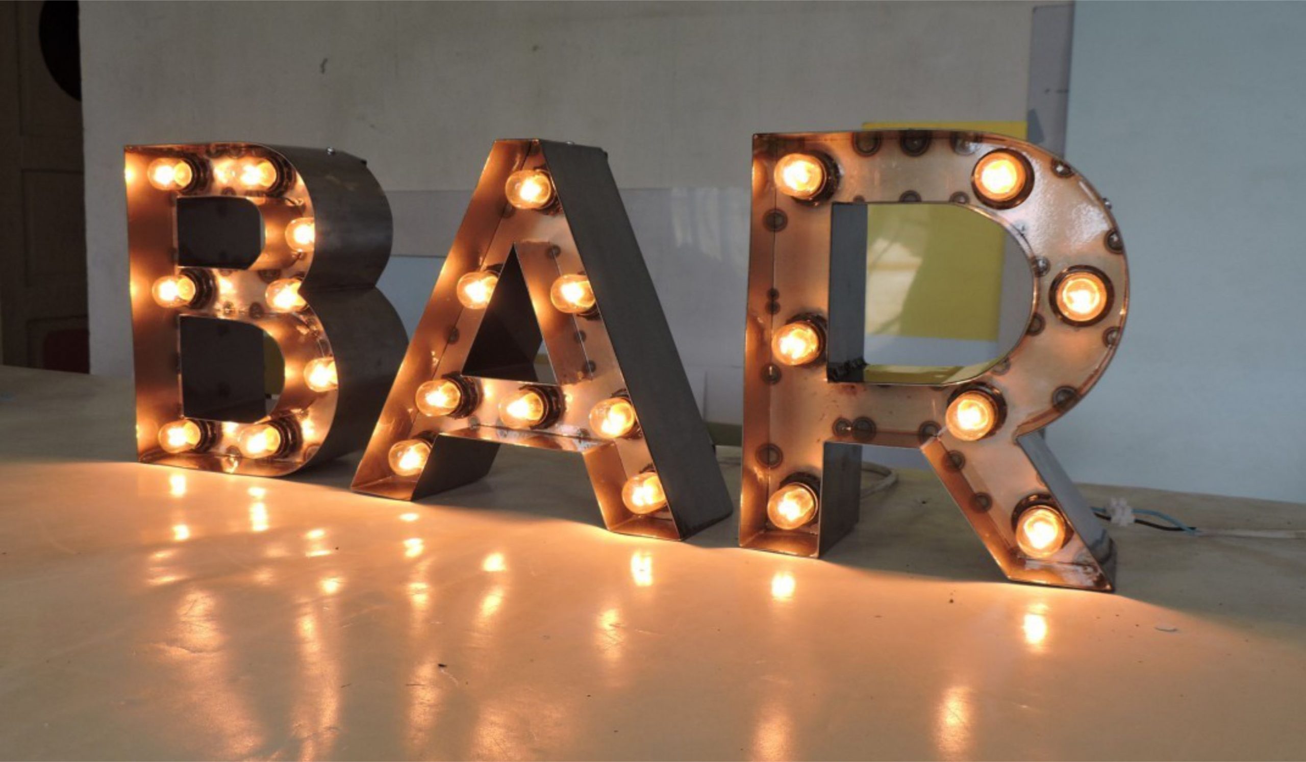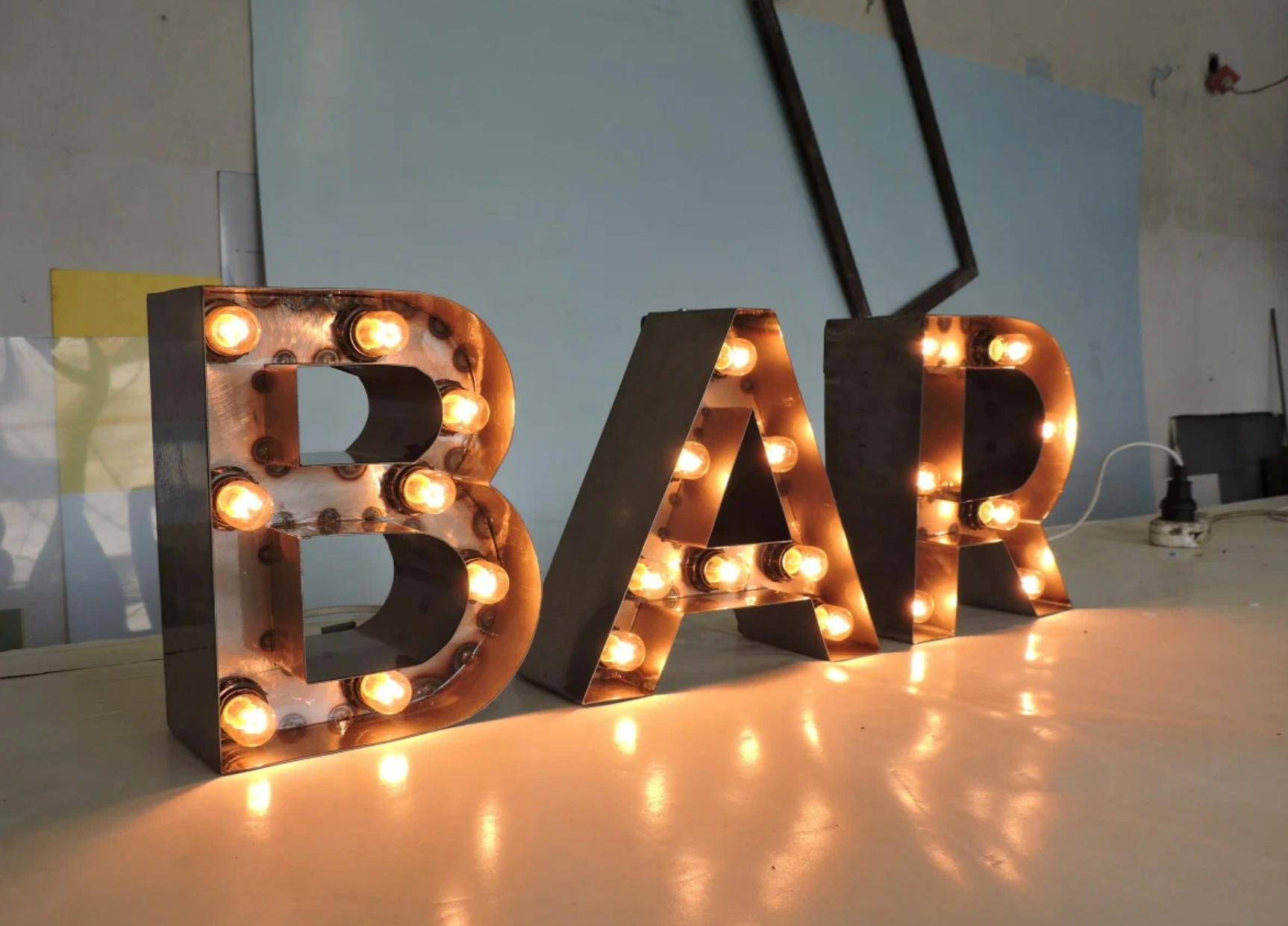 Корпус вырезается из фанеры или массива, искусственно состаривается, покрывается маслом или лаком. Лампочки крепятся прямо в дерево или в металлические основания. Такая вывеска создает максимально теплую, «домашнюю» атмосферу в эко-лавках, ремесленных мастерских, семейных кафе.