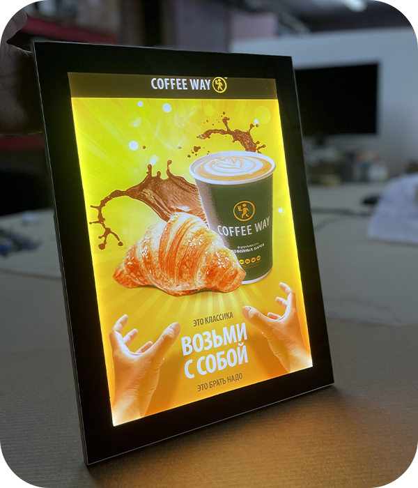 Доступны как односторонние, так и двусторонние панели: для размещения информации с одного или двух ракурсов. Размеры и формы могут быть как стандартными (квадратными, прямоугольными), так и выполненными по индивидуальным параметрам. Ширина рамки также может быть от ультратонкой до выразительной широкой.